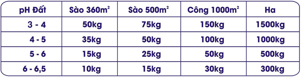 – Căn cứ vào pH đất, lượng dùng như sau