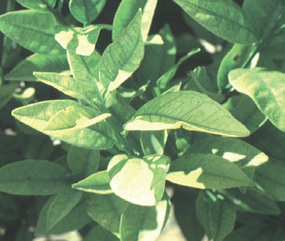 Bệnh lá vàng trắng trên cây họ citrus (họ cây có múi như cam, chanh,…), bệnh thường gây ra trong môi trường có pH cao (đất kiềm)