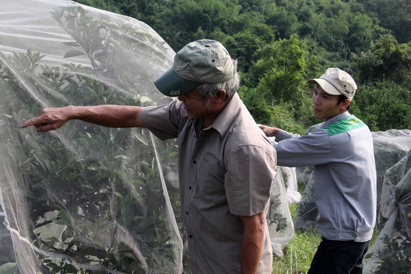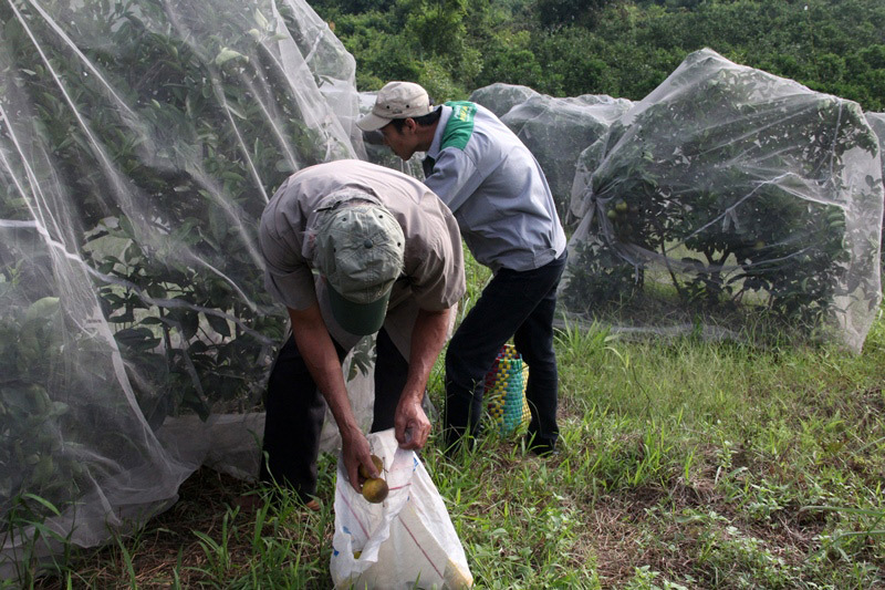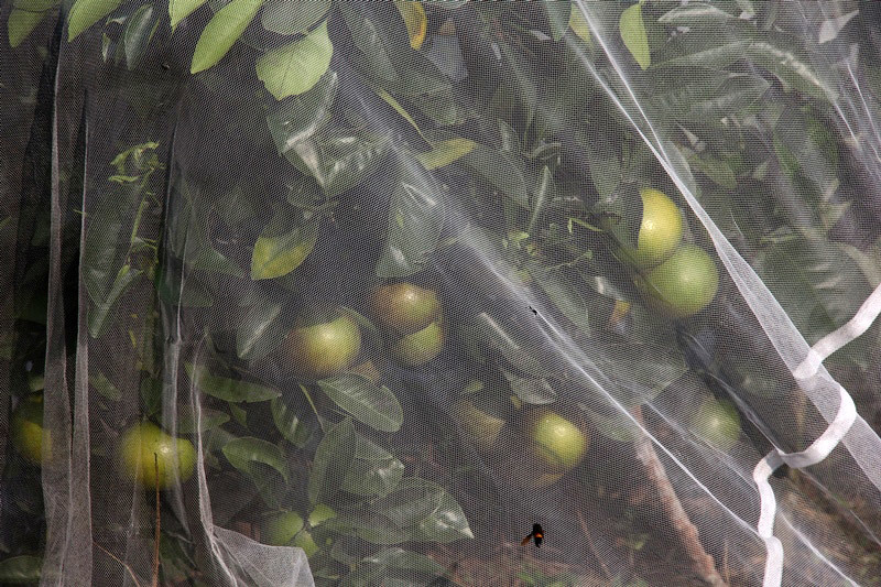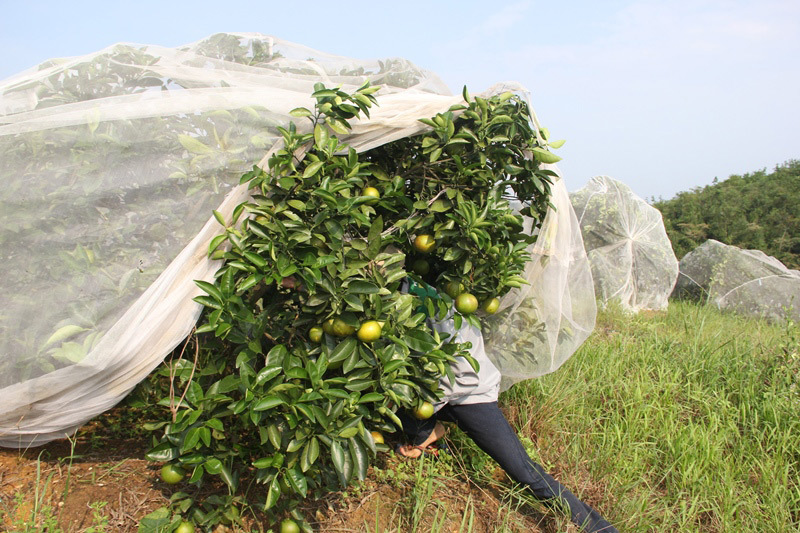 Vườn cam này mắc màn từ rằm tháng 7. Mục đích của việc mắc màn cho cây, theo ông Oánh, là để tránh bướm đêm chích làm thối quả. Ngoài ra, để tránh ruồi vàng, bọ xít, sâu đục quả