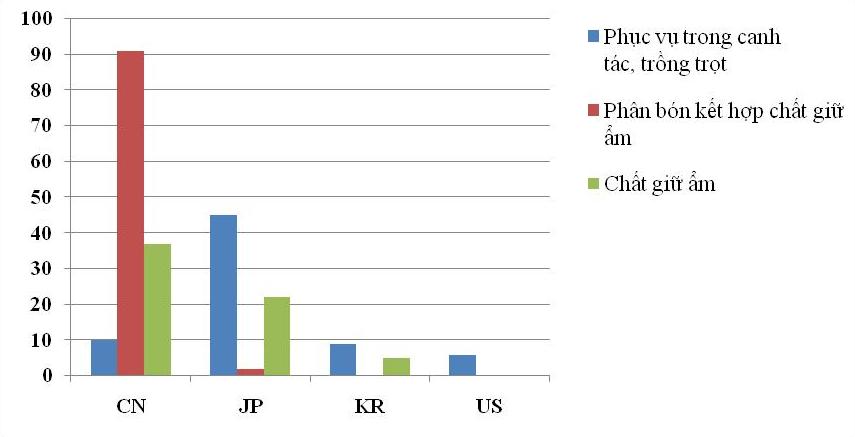 Trung Quốc có nhiều SC đăng ký, tập trung các nghiên cứu sản xuất phân bón kết kợp với chất giữ ẩm, chiếm 49% tổng SC về chất giữ ẩm. Nhật Bản, Hàn Quốc và Mỹ có nhiều SC về ứng dụng chất giữ ẩm phục vụ canh tác, trồng trọt. Nhật Bản có lượng SC về ứng dụng chất giữ ẩm phục vụ canh tác chiếm 54% trên tổng SC về chất giữ ẩm của họ; đối với Hàn Quốc thì tỷ lệ này là 47% và Mỹ là 50%.