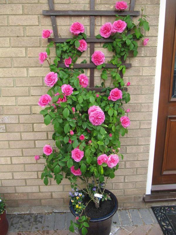 Hoa hồng leo thích hợp với sân thượng và ban công nhiều ánh nắng và nên trồng thành giàn thẳng đứng.