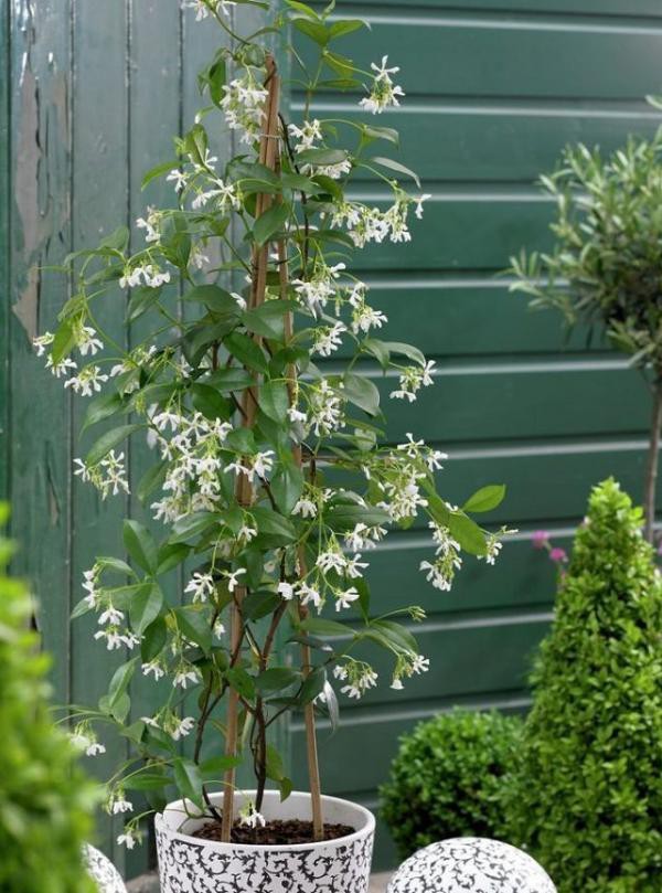 Trước cửa có khoảng không lớn thì bạn nên trồng chậu hoa dành dành leo, vẻ đẹp tinh khôi của hoa giúp căn nhà thơ mộng hơn.