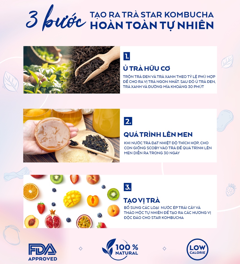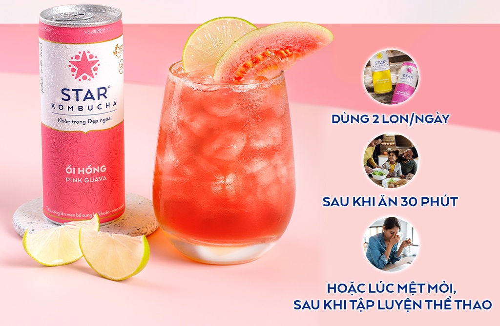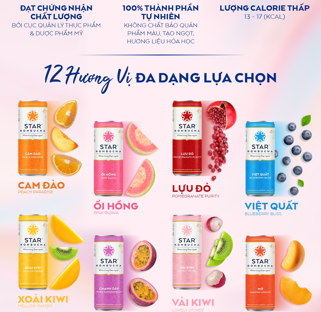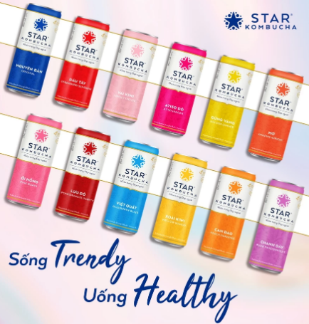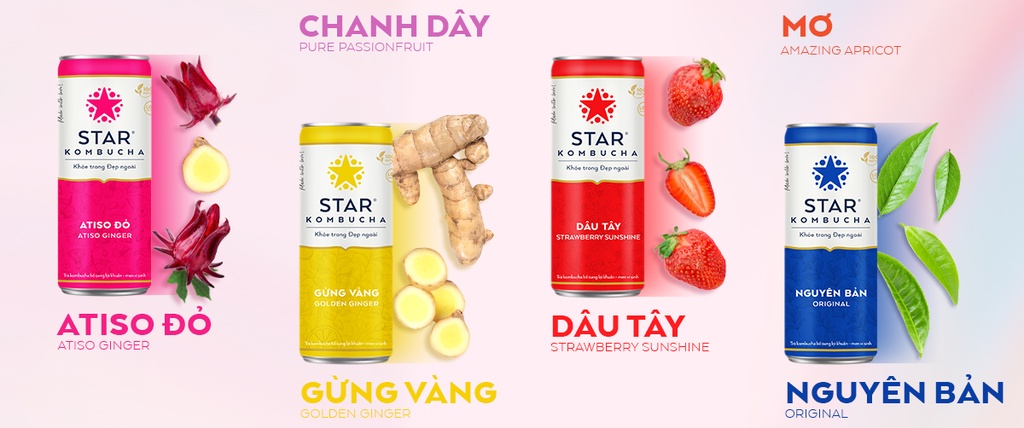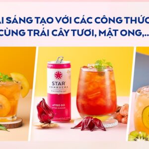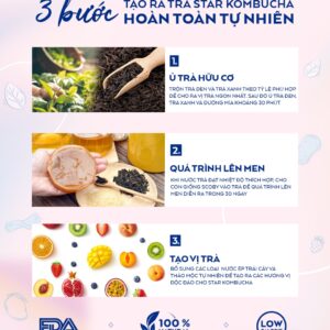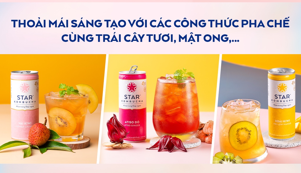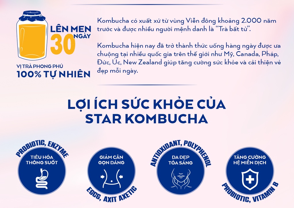 STAR KOMBUCHA là thương hiệu trà lên men Kombucha đầu tiên tại Việt Nam và được vinh danh xuất sắc Châu Á, thức uống tốt cho sức khỏe và sắc đẹp. Được lên men 100% thành phần tự nhiên từ trà, con men SCOBY nhập khẩu từ Hoa Kỳ, nước ép trái cây và thảo mộc. Quy trình lên men được kiểm soát từ Hiệp hội Kombucha Quốc tế cùng công nghệ tiên tiến Hoa Kỳ, trà lên men Star Kombucha chứa lượng lớn lợi khuẩn Probiotics và các dưỡng chất Vitamin C, Vitamin B, Polyphenols, EGCG giúp tiêu hóa thông suốt, giảm cân gọn dáng, da đẹp, tăng cường đề kháng và nhiều lợi ích khác đối với sức khỏe.